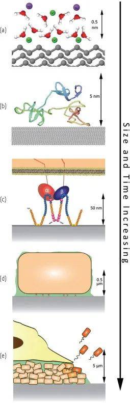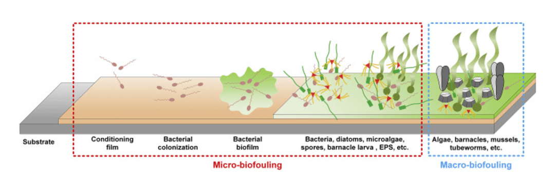 生物污染是一個非常動態(tài)的過程,它跨越許多長度和時間尺度(上圖)。海洋環(huán)境中新表面的污染通常被描述為四個階段的過程:有機分子調節(jié)層的形成,細菌和硅藻等微生物的初級定殖,藻類孢子的單細胞定殖,以及多細胞大型污染物的附著。
