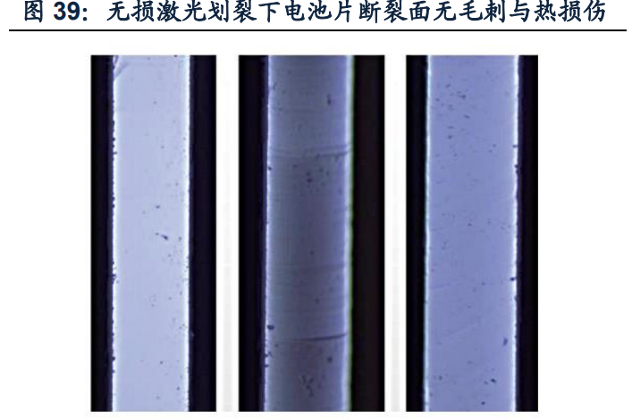 無損激光劃裂優勢顯著,有望成為行業新一代主流技術。無損激光劃裂技術具備截 斷面干凈、不存在損傷點、加工產生的硅粉塵數量少、抗彎強度保持不變等特點, 解決了常規激光劃裂造成的電池片損傷問題,能將切片前后電池性能損失降到最小, 助推組件輸出功率提升。對應無損激光劃裂設備,帝爾激光、海目星、奧特維等多 家公司已推出成熟產品,隨著半片、疊瓦等高效光伏組件技術市場份額持續提升, 相關設備有望持續放量。