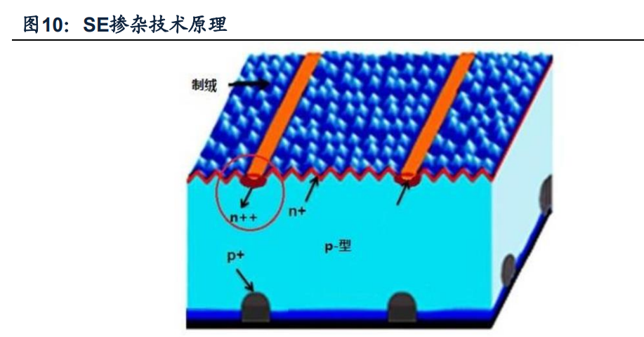 SE摻雜技術可有效解決輕重摻雜選擇矛盾。SE摻雜全稱為發射極選擇性摻雜,通過 在光伏電池電極柵線與硅片接觸部位區域進行高濃度磷摻雜,從而降低電極和硅片 之間的接觸電阻;并在電極以外區域進行低濃度淺摻雜,降低表面復合速率,從而 有效實現電池的開壓、電流和填充因子改善。SE摻雜技術兼顧輕重摻雜兩者的優點, 有效提高了光電轉換效率。