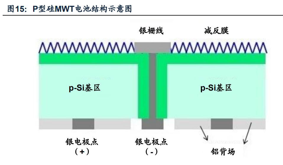 MWT激光開孔技術可用于PERC電池,提升光電轉換效率約0.4%。MWT全稱為金 屬穿孔卷繞技術,采用激光打孔、背面布線的技術消除正面電極的主柵線,正面電 極細柵線搜集的電流通過孔洞中的銀漿引到背面。此設計下,光伏電池的正負電極 點都分布在電池片背面,有效減少了正面柵線的遮光,提高光電轉換效率,同時能 降低銀漿消耗量和金屬電極-發射極界面的載流子復合損失,具備降本增效的功能。