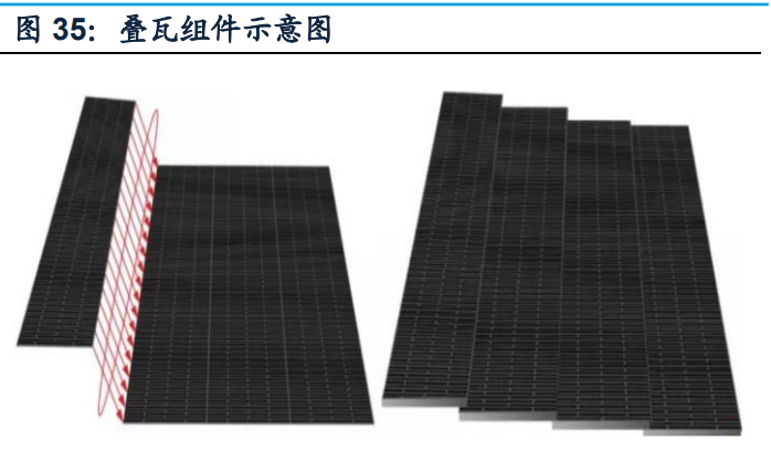 (2)疊瓦組件:疊瓦組件是指將太陽能電池在優化柵線設計后切成多個小片,然后 將每小片以類似導電膠的方式疊加串聯,通過串并聯的方式做成組件,令電池間的 縫隙降到最低,因此在同樣的單位面積中可以鋪設更多電池,增加組件輸出功率。