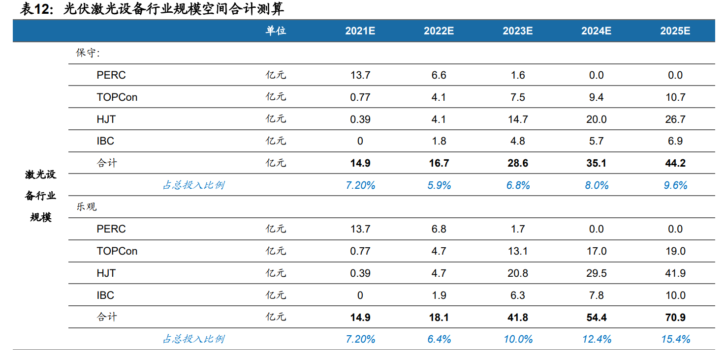結合激光轉印與其他激光設備應用,我們認為光伏激光設備合計規模在2025年 保 守 / 樂 觀 情 形 下 有 望 達 到 44.2/70.9 億元, 21-25 年 CAGR 分別達到 31.3%/47.7%。2025年,保守和樂觀情形下,激光設備占總設備投入的比例分 別達到9.6%/15.4%,較2021年的占比7.2%明顯提升,主要原因為激光設備在 光伏電池片生產領域功能和重要性不斷提高,光伏激光設備單GW價值量的提升、 以及各項技術使用滲透率提高。