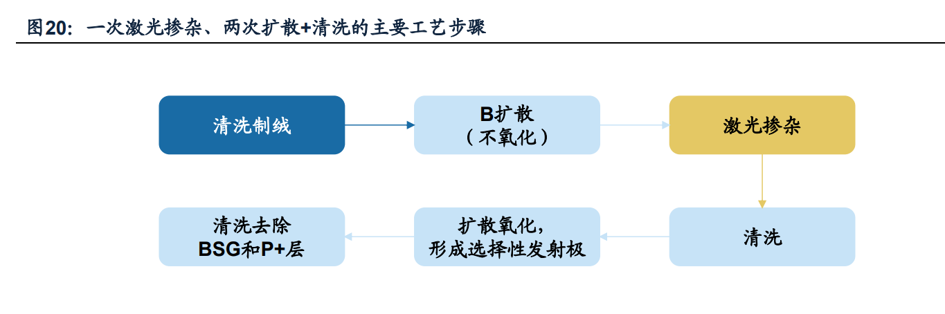 激光硼摻雜主要分為兩種產業化路徑。(1)一次激光摻雜、兩次擴散+清洗:根據 天合光能CN110299422A發明專利,工藝步驟主要為首先對N型硅片進行清洗制絨, 隨后進行硼擴散,推進形成高硼表面濃度的P++層,不進行氧化過程。之后采用激 光對柵線區域進行摻雜推進,并清洗。由于激光較高能量會損傷硅襯底,因此需要 放回擴散爐進行氧化形成選擇性發射極,結束后清洗去除背面的BSG和P+層。該產 業化路徑下,雖然激光摻雜僅使用一次,但需進行兩次擴散+清洗,導致相應設備投 資額增加,抬升生產成本。