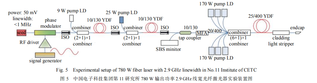 2014 年, 中國電子科技集團有限公司第 11 研究所利用正弦調制方式將單頻激光器的光譜線寬展寬為2.9 GHz,采用三級放大結構進行放大,實驗裝置如圖 5 所示。采用 976 nm 的半導體激光器泵浦基于 25/400 光纖的主放大系統(tǒng)進行放大,激光器最終輸出功率達到了 780 W,光譜線寬保持為 2.9 GHz,光束質量為