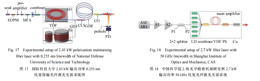 2015年,中國科學院上海光學精密機械研究所報道了1.75 kW窄線寬光纖激光器,激光光束質量為M2=1.77,光譜線寬20 GHz[39]。2017 年,進一步采用 ASE 種子源,通過三級放大的激光系統(tǒng),如圖 18 所示,實現(xiàn)了 2.7 kW 激光輸出,光束質量為 M2<1.2,光譜線寬為 50 GHz,在最高輸出功率下,沒有發(fā)生 SBS 效應和 MI 效應,進一步功率提升受限于泵浦功率[40]。