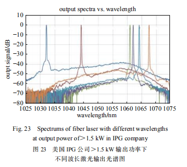 2016 年,美國 IPG 公司的 Roman Yagodkin 等對單頻激光器進行相位調制作為種子源,經(jīng)放大后得到>1.5 kW 激光輸出,激光中心波長范圍為 1030~1070 nm,光譜線寬<15 GHz[50],不同波長下的輸出光譜圖如圖 23 所示。從光譜圖中可以看出,相對于 1064 nm 附近的激光,短波長激光光譜的 ASE 抑制比低約 15 dB。2017 年,美國 IPG 公司又對 1030 nm 的單頻激光器進行相位調制,使光譜展寬為20 GHz,經(jīng)過三級預放大級后輸出功率達到 15~20 W,最后經(jīng)主放大級放大后得到 2.2 kW 短波長激光輸出, 是目前1030 nm 波段光纖激光器的最高輸出功率[50]。