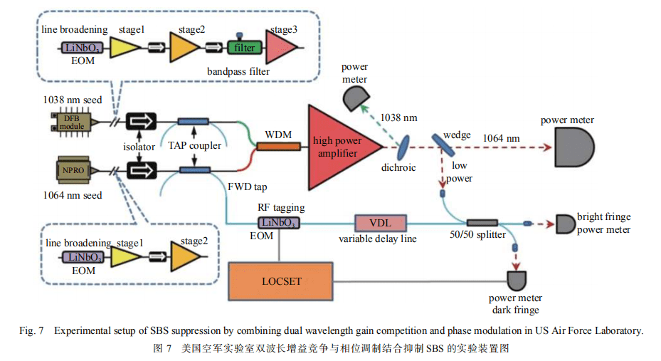 2016 年,美國空軍實驗室的 Nader A. Naderi 等進一步采用雙波長種子注入和相位調制的方式實現(xiàn)了 1 kW 激光輸出,線寬為 2.3 GHz,實驗裝置如圖 7 所示。采用寬帶 1038 nm 和窄帶 1064 nm 的種子源同時注入,主放大級采用 25/400 增益光纖進行放大。種子源利用 PRBS 信號進行相位調制,通過雙波長激光器的增益競爭效應和相位調制展寬光譜來同時抑制 SBS 效應。在實驗中,通過優(yōu)化兩種波長種子源的功率配比和相位調制參數(shù),最終在 1064 nm 波段實現(xiàn)了 1 kW 激光輸出,輸出激光光束的質量因子 M2 介于 1.1~1.2 之間,光譜線寬為 2.3 GHz[27]。