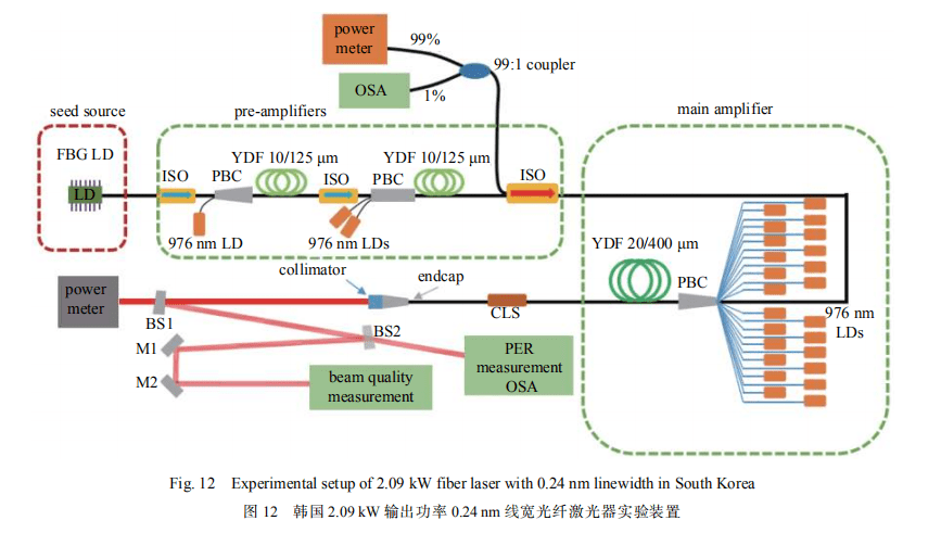 2019 年,韓國國防發(fā)展局地面技術研究所報道了 2.05 kW 窄線寬光纖激光器,實驗裝置如圖 12 所示。與清華大學精密儀器系 2.19 kW 窄線寬光纖激光器的技術方案類似,他們采用光譜線寬為 0.08 nm 的光纖光柵產(chǎn)生窄線寬振蕩器,放大級泵浦源為波長鎖定的 976 nm 半導體激光器,泵浦方式為正向泵浦,增益光纖為 20/400 摻鐿光纖, 經(jīng)放大后輸出功率達到 2.05 kW,光譜線寬展寬為 0.24 nm,輸出激光的光束質量為 M2=1.28。在最高輸出功率下,沒有發(fā)生 SBS 效應和 MI 效應,但是隨著輸出功率的提升,光譜展寬非常明顯,在更高輸出功率下,光譜線寬將會是限制其應用的主要因素[32]。