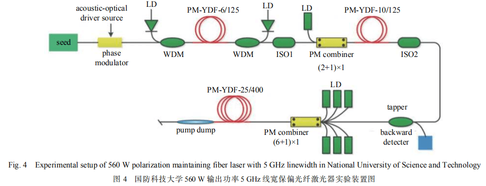 2012 年,國防科技大學采用白噪聲信號對單頻激光器進行相位調制,使其光譜展寬約為 0.3 GHz,該種子源輸出功率為 10 mW,之后該種子源經(jīng)過四級放大器進行放大,最終獲得了功率為 666 W 的窄線寬激光輸出,光譜線寬小于 0.3 GHz[22]。2015 年,國防科技大學采用 976 nm 的半導體激光器泵浦基于 25/400 保偏光纖的放大系統(tǒng),對窄線寬種子源進行放大,實驗裝置如圖 4 所示。種子源采用正弦信號對單頻激光器進行相位調制,使光譜展寬為約5 GHz,經(jīng)放大后將線偏激光的輸出功率提升到了 560 W,光束質量為 M2=1.3,光譜線寬保持約為 5 GHz,偏振消光比為~ 14 dB。理論研究結果表明 5 GHz 線寬的種子源 SBS 閾值為 1.2 kW, 輸出功率的進一步提升主要受限于MI 效應[23]。