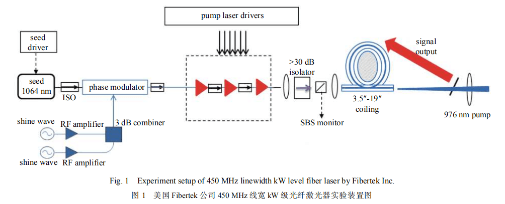 2011 年,美國 Fibertek 公司的 Doruk Engin 等報道了線寬為 450 MHz,輸出功率達到 1 kW 的光纖激光器,實驗裝置如圖 1 所示。采用雙通道正弦信號調制單頻種子光,將線寬展寬為 450 MHz,再經(jīng)過三級放大實現(xiàn) 1 kW 激光輸出。主放大級采用 35/500 的增益光纖以降低纖芯中的功率密度, 抑制 SBS 效應, 輸出激光的光束質量為M2<1.4[18]。