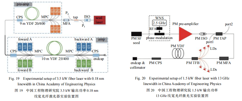 2019 年,中國工程物理研究院應用電子學研究所又進一步研究了保偏窄線寬光纖激光器,實驗裝置如圖 20 所示。種子源采用白噪聲信號相位調制方式展寬單頻激光器光譜,之后通過多級放大器進行功率放大。實驗中對比了不同光譜線寬下的 SBS 閾值,當光譜線寬為 13 GHz 時,實現(xiàn)了 1.5 kW 線偏振激光輸出。隨著激光輸出功率的增加,輸出激光沒有發(fā)生明顯的模式劣化現(xiàn)象,即沒有達到 MI 閾值,功率的進一步提升受限于 SBS 效應[42]。當光譜線寬為 32 GHz 時,實現(xiàn)了 2.62 kW 線偏激光輸出,光束質量為 M2<1.3,偏振消光比為 96.3%,功率的進一步提升受限于 MI 效應[43]。