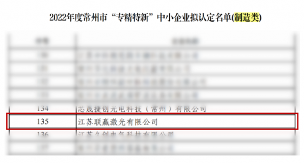 近日,常州市工信局發(fā)布2022年度常州市“專精特新”中小企業(yè)擬認定名單,深圳市聯(lián)贏激光股份有限公司(以下簡稱:聯(lián)贏激光)全資子公司江蘇聯(lián)贏激光有限公司(以下簡稱:江蘇聯(lián)贏)憑借在技術(shù)創(chuàng)新、科技研發(fā)與成果轉(zhuǎn)化等方面的突出表現(xiàn)榮登榜單!