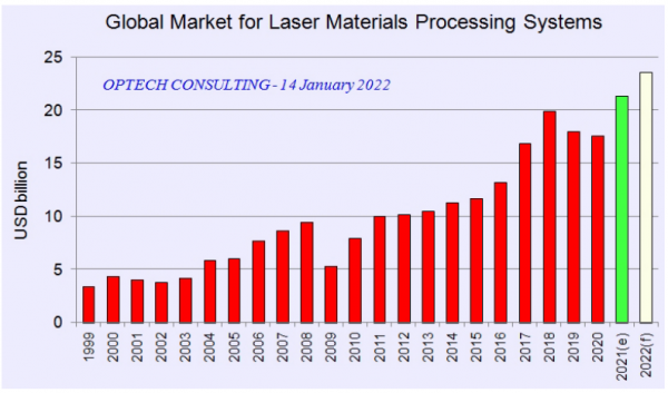2022年,工業激光器和激光系統市場預計將以略高于10%的速度增長。預計到2026年,該市場依然會保持較高的一位數增長。當然這一切預測都基于穩定的經濟環境。