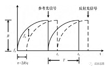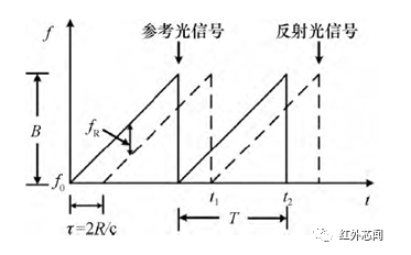 調頻連續波激光雷達的測量原理如圖2所示。由于探測光信號為線性調頻信號,其瞬時頻率與時間成線性關系。當回波延時存在時,反射光信號與本振光信號間將產生正比于回波延時的瞬時頻率差。在實際激光雷達系統中,該差頻信號由反射光信號與本振光信號相干拍頻獲得。相干拍頻時,光電探測器產生的光電流信號進行低通濾波后,通過信號處理,即可獲得反射光信號的回波延時及目標距離信息。