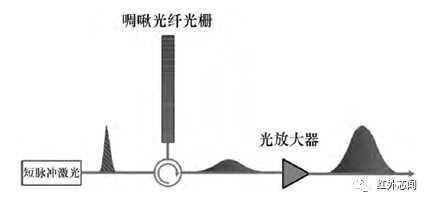 嚴格意義上,啁啾脈沖光源發射的并不是連續光,而是由脈沖序列組成的光信號。但是,啁啾脈沖激光可視為占空比較低的調頻連續波光信號,在脈沖內,光場瞬時頻率隨時間線性變化,與調頻連續波激光雷達的測量原理一致。因此,本文中將基于啁啾脈沖激光光源的調頻連續波激光雷達作為調頻連續波激光雷達中的一類。啁啾脈沖激光可通過多種方法產生,包括時域拉伸、傅里葉域鎖模激光器,移頻反饋激光器等。其中應用最廣泛的是時域拉伸,基本原理如圖5所示。