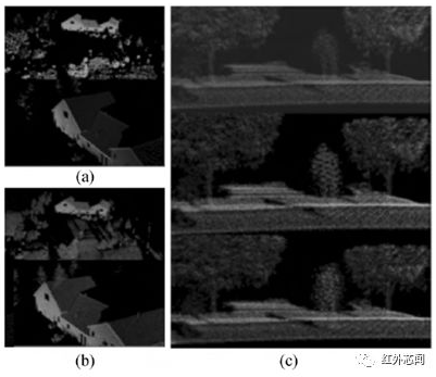 2017年美國陸軍地理空間實驗室的研究人員對比了脈沖激光雷達和調頻連續波激光雷達的三維成像效果,結果如圖7所示。其中圖(a)為脈沖激光雷達的成像結果,圖(b)為調頻連續波激光雷達的成像結果。對比發現,調頻連續波激光雷達可以觀察到更多的局部細節,實現更高精度的三維成像。同時,由于采用了相干探測方式,調頻連續波激光還可以實現對運動目標的多普勒成像。通過對運動物體進行多普勒成像,激光雷達可以區分出運動物體與靜止物體,結果如圖(c)所示。該特點在自動駕駛領域中具有重要的應用價值。通過對運動物體進行速度測量,有助于自動駕駛系統進行預判,提高駕駛安全性。