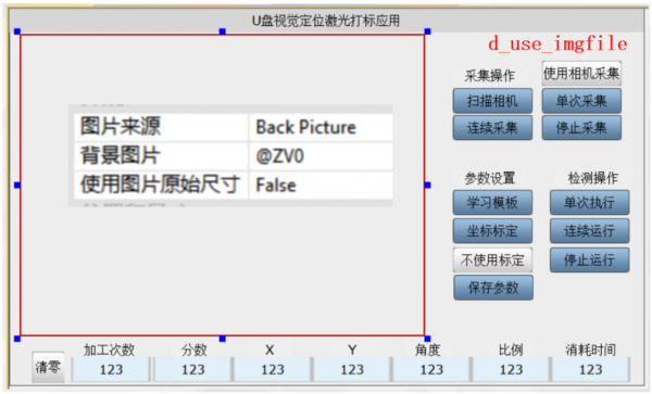 先使用學習模板創建U盤的形狀模板,接著將形狀模板位置結果作為基準位置。然后進行九點標定,將我們的像素坐標轉換成世界坐標系。最后將標定后匹配定位出來的U盤的位置信息顯示出來,并統計當天上料次數。
