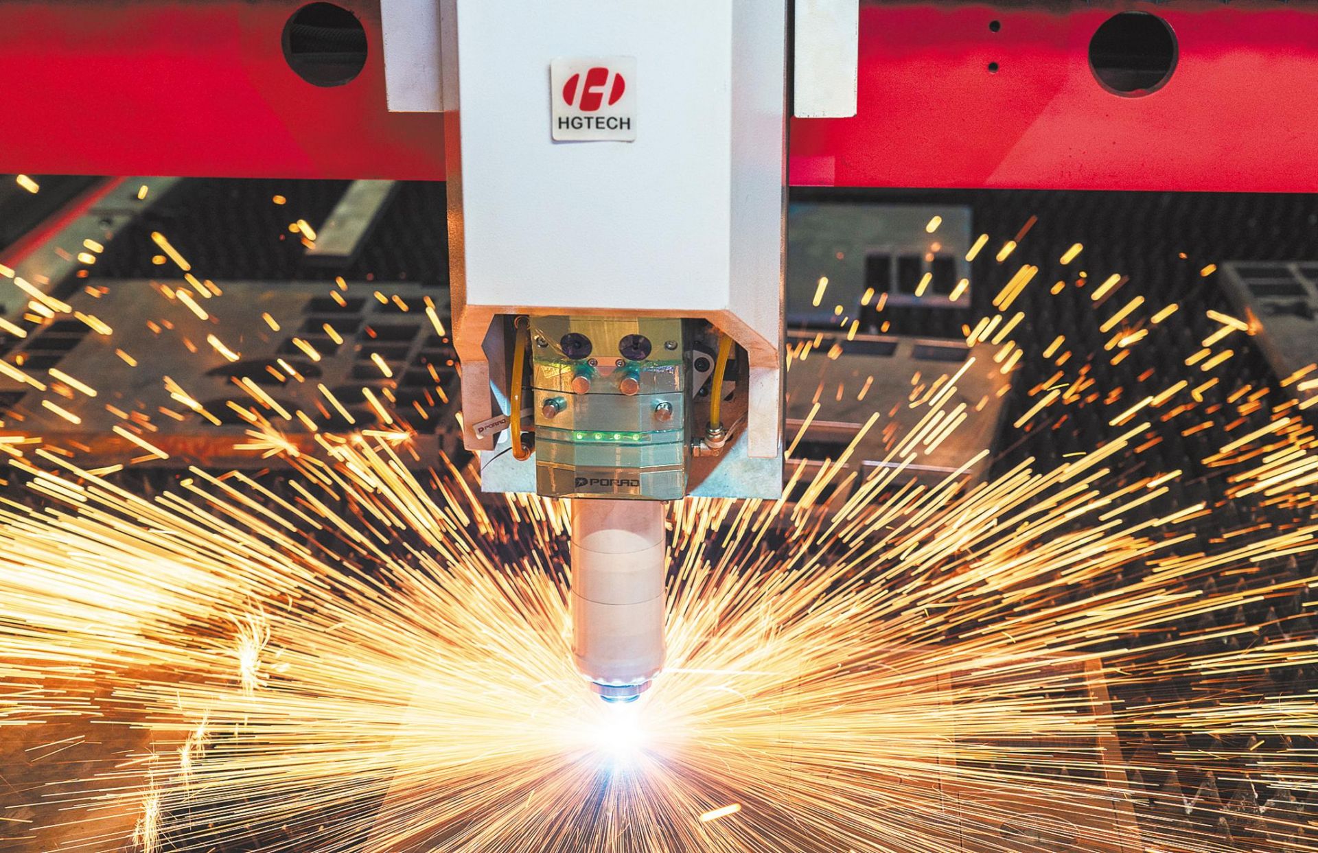 華工激光產業園內,正在測試、校準的智能激光切割機切割鋼板。