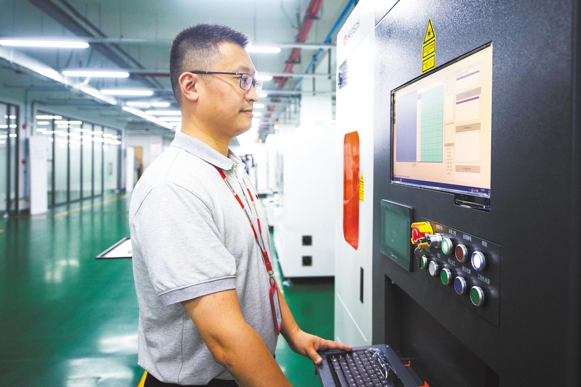 華工激光副總工程師程偉正在操作公司新近開發的IC載板激光刻蝕裝備。