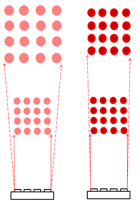 圖 1. 激光雷達(dá)光源探測示意圖,左為常規(guī),右為更高功率密度、更小發(fā)散角優(yōu)化結(jié)果。