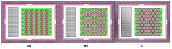 圖 4.填充因子優(yōu)化機理。a)填充因子為27.0%的版圖設(shè)計,b)填充因子為42.0%的版圖設(shè)計,c)填充因子為48.8%的版圖設(shè)計。