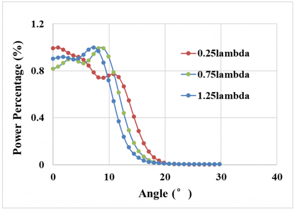 為了證明基于不同氧化層位置的發(fā)散角優(yōu)化設(shè)計,我們增大了波導(dǎo)層厚度,保證氧化層和有源區(qū)的光學(xué)距離為0.25lambda,0.75lambda,和1.25lambda。如圖7所示,使用10kHz 10ns短脈沖測試條件,發(fā)散角分別優(yōu)化至27.9°、26.6°和24.6°。