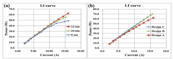 圖8.不同填充因子設(shè)計的LI性能對比。a)不同氧化孔徑尺寸下的LI曲線,b)不同填充因子版圖設(shè)計A、B、C的LI曲線。
