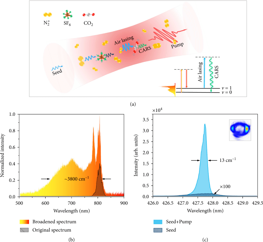 飛秒激光與空氣分子的極非線性相互作用激發了分子氮離子的光學增益,并實現了1000倍以上的種子放大,從而產生線寬為13 cm-1的428 nm空氣激光。