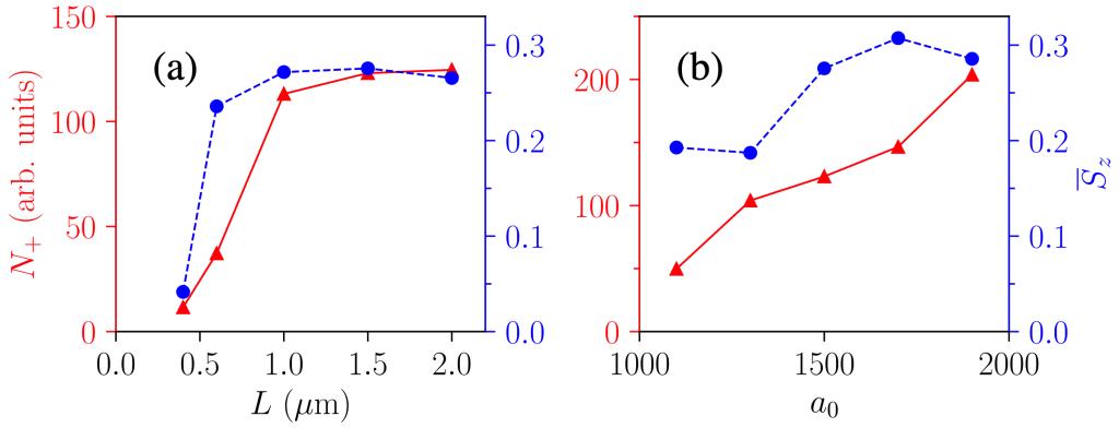 圖2.正電子產額和極化率隨(a)預等離子體密度標長和(b)激光場強的變化。