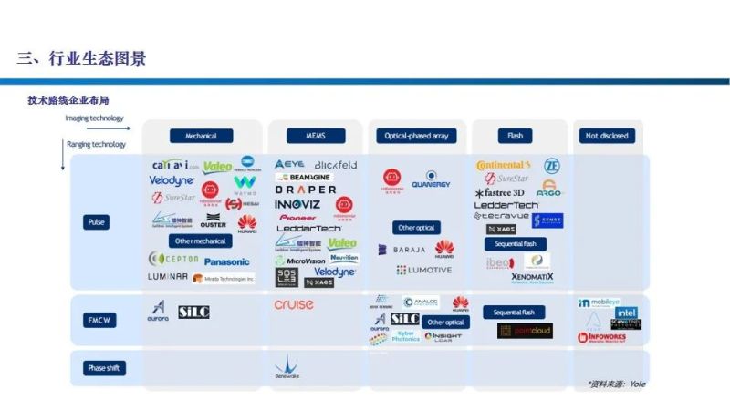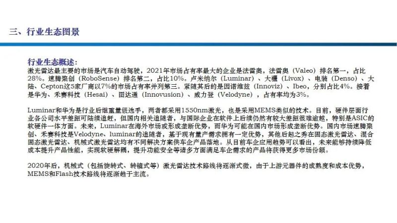 2020年后,機(jī)械式(包括旋轉(zhuǎn)式、轉(zhuǎn)鏡式等)激光雷達(dá)技術(shù)路線將逐漸式微,由于上游元器件的成熟度和成本優(yōu)勢,MEMS和Flash技術(shù)路線將逐漸趨于主流。