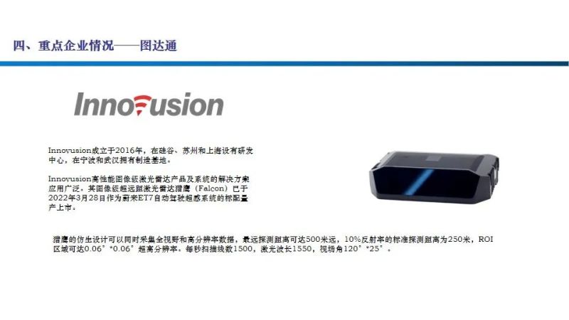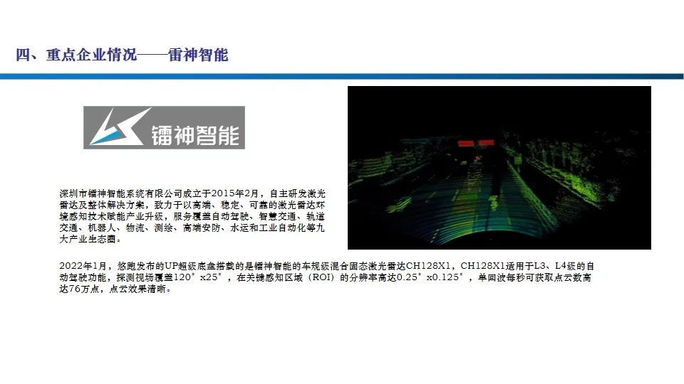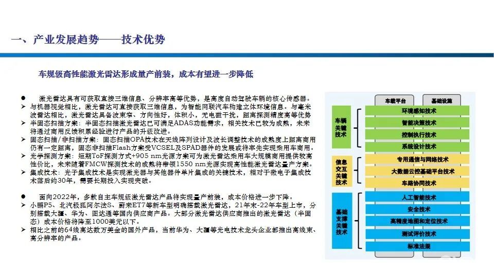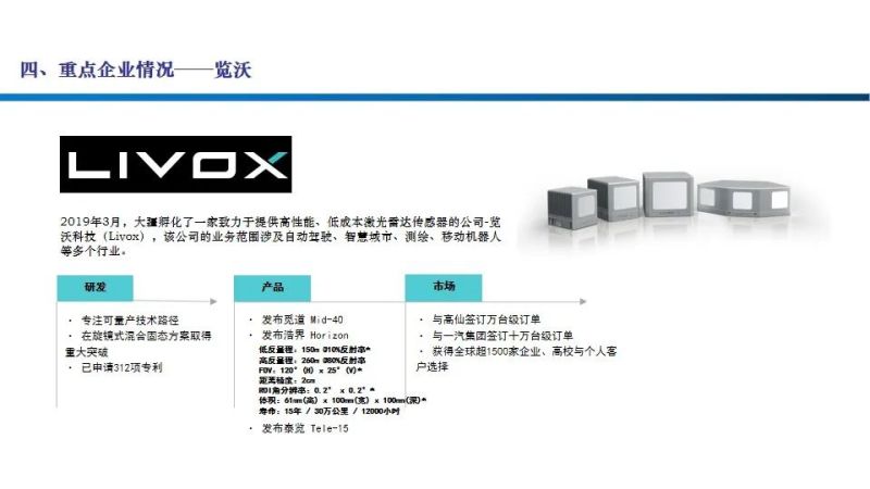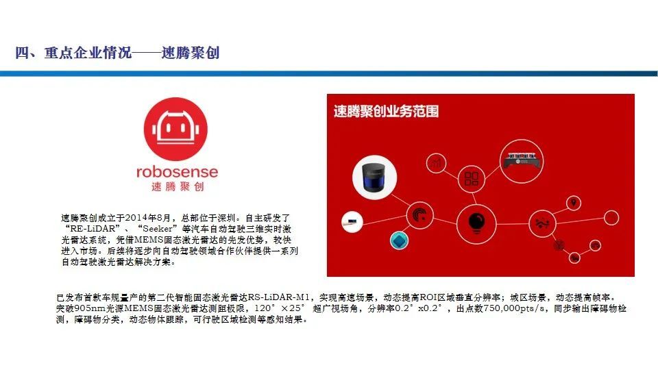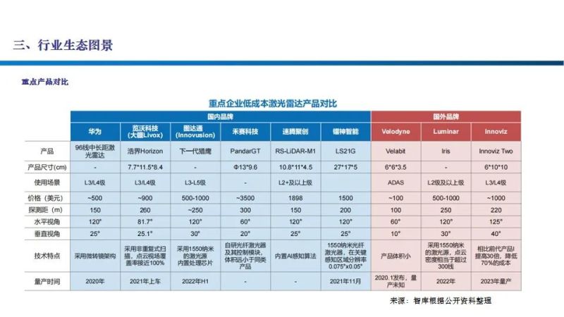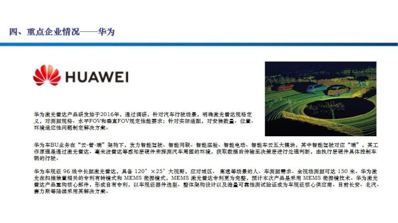 Luminar和華為是行業(yè)后繼重量級選手,兩者都采用1550nm激光,也是采用MEMS類似的技術(shù)。目前,硬件層面行業(yè)各公司水平差距可陸續(xù)追趕,但國內(nèi)相關(guān)追隨者,與國際企業(yè)在軟件上后續(xù)仍然有較大差距很難逾越,特別是ASIC的軟硬件一體方面。未來,Luminar在海外市場或形成壟斷優(yōu)勢,而華為可能在國內(nèi)市場形成壟斷優(yōu)勢。國內(nèi)市場速騰聚創(chuàng)、禾賽科技是Velodyne、luminar的追隨者,基于現(xiàn)有量產(chǎn)需求擁有一定優(yōu)勢,其他后起之秀在固態(tài)激光雷達(dá)、混合固態(tài)激光雷達(dá)、機(jī)械式激光雷達(dá)均有不同解決方案供車企產(chǎn)品落地。從目前車企應(yīng)用趨勢可以看出,未來能夠持續(xù)降低成本提升產(chǎn)品性能,實(shí)現(xiàn)軟硬解耦,提升功能安全等諸多方面滿足車企需求的產(chǎn)品將獲得更多市場份額。