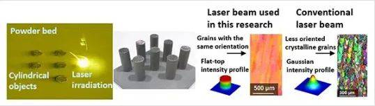 △從左到右:激光束照射在粉末床上,產生的圓柱形單晶物體。(右)可以應用平頂激光束形成以相同取向排列的晶體,而應用傳統的高斯激光束會導致晶粒取向較小
