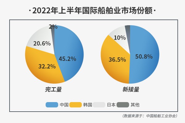 據中國船舶工業協會發布,2022年上半年,中國造船完工量、新接訂單量、手持訂單量分別占全球市場份額的45.2%、50.8%和47.8%,位居世界第一;其中,出口船舶占全國造船完工量、新接訂單量、手持訂單量的比重分別為85.5%、91.0%和88.7%。