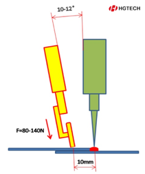 隨行壓輪系統裝置與激光頭的安裝角度一般為10-12°,其滾輪材質一般為鉻鎬銅(CuCrZr)、黃銅(H65)或紫銅(T3);優選鉻鎬銅(CuCrZr),鉻鎬銅不僅具有良好的防飛濺粘連性能,還有硬度高、耐磨的特點。滾輪距離熔池間距一般為10mm;若距離太近,熔池的高溫會灼蝕滾輪,影響滾輪的使用壽命;若距離太遠,滾輪的壓緊效果會降低,從而導致焊縫間隙難以保證。