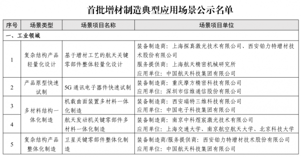 8月2日,材料學網注意到工信部網站公布了首批增材制造典型應用場景名單。