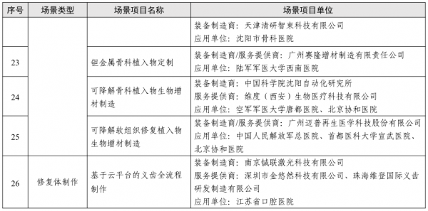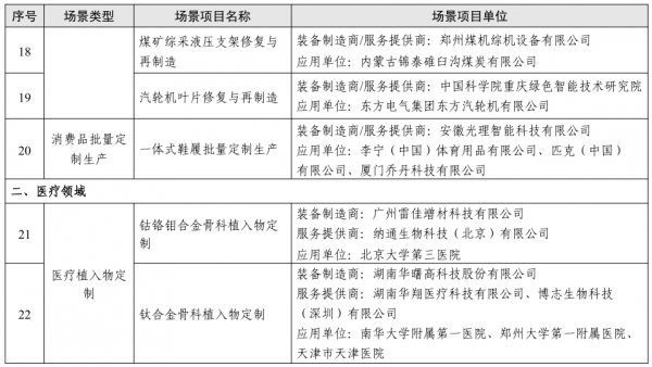 涉及的應用場景包括:復雜結構產品輕量化設計、產品原型快速試制、多材料結構一體化制造、復雜結構產品整體化制造、零件批量生產、專用工具工裝制作、專用模具制造、零件修復再制造、消費品批量定制生產、醫療植入物定制、修復體制作、診療輔助器具制作、個性化矯正器具打印、細胞/組織/器官打印、建筑設施整體制造、文物復刻展示。涵蓋包括工業、醫療、建筑、文化在內的四領域36項。