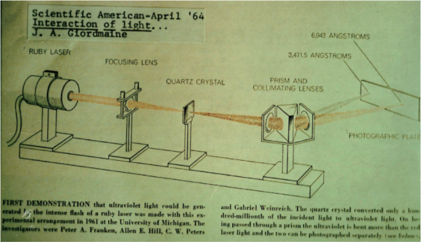 會議結束后,Franken回到了安娜堡馬上著手組建團隊,準備實驗。他找了物理系的兩個同事Peters教授和Weinreich教授一起討論,Weinreich指出需要用中心對稱破缺的光學晶體才能實現光學二倍頻,石英晶體是個合適的選擇。三人共同設計了實驗方案,Franken又找來物理系的本科生Alan Hill來做這個實驗。