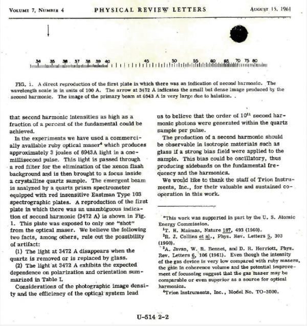 這篇文章于1961年8月發表,是大家公認的開啟了非線性光學這門學科的一篇文章,標志著非線性光學的誕生(圖5)[4]。