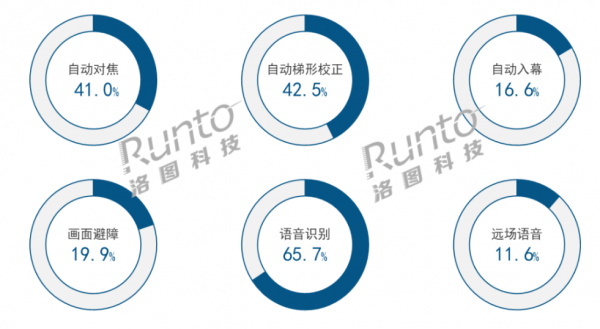 根據洛圖科技(RUNTO)線上數據顯示,2022年上半年,自動對焦和自動梯形校功能已經滲透了四成以上的份額。自動入幕和畫面避障功能異軍突起,盡管份額還不到兩成,但漲幅超過了一倍。