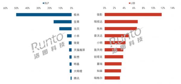 數(shù)據(jù)來源:洛圖科技(RUNTO)線上數(shù)據(jù),單位:%目前LCD投影的均價僅為DLP的三分之一,因而受到價格敏感型消費者和嘗鮮型消費者的青睞。毋庸置疑的是,單片式LCD投影已經(jīng)上升為行業(yè)主流,成為廠商近階段投入的焦點。