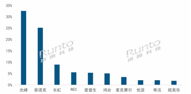 教育市場出貨量完成2.6萬臺,同比下降7.4%。一方面原因來自于,盡管國家和各省對教育的支出持續增加,但資源持續向軟件和平臺內容而非硬件傾斜。另一方面是來自競品交互平板的市場壓力,液晶交互平板、智慧黑板憑借其便捷的交互功能搶占了不少市場份額。從品牌格局來看,國產品牌表現較好;光峰、索諾克深耕教育市場,兩品牌市占總和高達57.8%。鴻合、希沃市場下降明顯,份額跌至5.1%和2.1%。