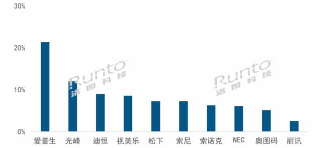 工程市場出貨量完成4.3萬臺,同比下降20.0%。在市場縮量的情況下,品牌排位開始發生變化。日系品牌快速衰退,愛普生盡管依然排名第一,但和索尼在工程市場的出貨量均發生了50%以上的同比下滑。同時,國內品牌光峰、迪恒、視美樂市場份額提升明顯。光峰以ALPD激光顯示技術優勢,憑借差異化、細分化的產品設計,市場份額達到12%,增長4個百分點,排位第二。迪恒、視美樂分別側重泛工程市場和文旅項目開拓,同比增長70%左右,排名位居第三和第四。