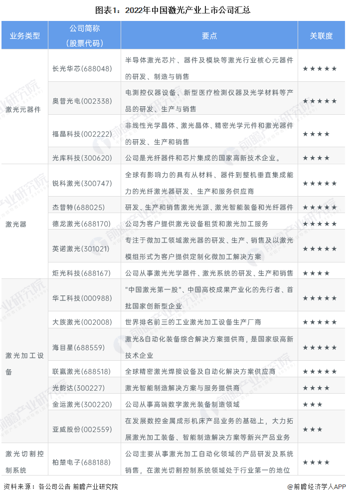 激光元器件企業有福晶科技(002222)、長光華芯(688048)、光庫科技(300620)、奧普光電(002338);激光器企業有銳科激光(300747)、炬光科技(688167)、杰普特(688025)、德龍激光(688170)、英諾激光(301021);激光加工設備企業有大族激光(002008)、華工科技(000988)、海目星(688559)、聯贏激光(688518)、亞威股份(002559)、金運激光(300220)、光韻達(300227);激光切割控制系統企業有柏楚電子(688188)等。