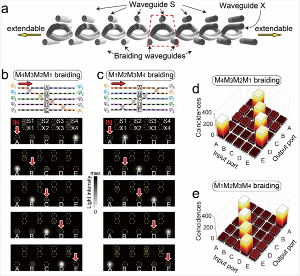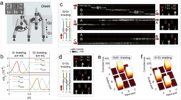 。這說明編織結(jié)果依賴于編織順序,即光子模式的編織操作具有非阿貝爾特性,這些特性在實驗上被證實(圖3c-f)。而非阿貝爾編織的另一個重要特性GiGi+1Gi = Gi+1GiGi+1也在實驗上被成功表征。