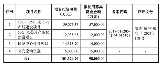 此次IPO,源杰科技擬在國泰君安證券擔任保薦機構下,在上交所科創板發行不超1500萬股,募集資金9.8億元。其中,5.7億元用于“10G、25G光芯片產線建設項目”、1.2億元用于“50G光芯片產業化建設項目”、1.4億元用于“研發中心建設項目”、1.5億元用于“補充流動資金”。