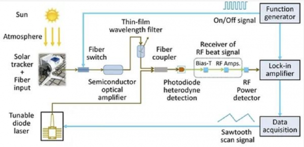 激光外差光譜儀因具有高光譜分辨率、體積小、易集成等優(yōu)點(diǎn),已經(jīng)逐漸發(fā)展成為與地基傅里葉變換光譜儀互補(bǔ)的溫室氣體柱濃度與廓線測量工具。激光外差光譜技術(shù)因受限于光學(xué)天線理論,無法通過增加光學(xué)接收口徑的方法提高外差信號(hào)信噪比,這導(dǎo)致高分辨率激光外差探測中氣體廓線測量精度受限。對(duì)此,研究人員提出基于半導(dǎo)體光放大技術(shù)的微弱太陽光放大方法,解決了高分辨率激光外差探測中光學(xué)天線理論限制的外差信號(hào)信噪比提高問題。研究結(jié)果表明,相比于傳統(tǒng)的高分辨率激光外差光譜儀,所研發(fā)的基于半導(dǎo)體光放大的高分辨率激光外差光譜儀的弱光信號(hào)探測和氣體濃度測量精度得到大幅提升。