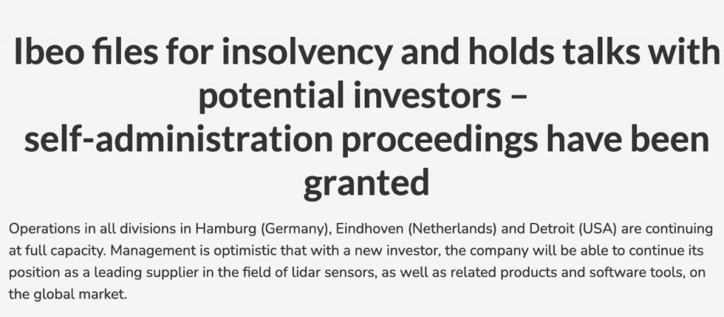 9 月 30 日,德國激光雷達公司 Ibeo 在官網宣布,已向漢堡破產法院申請破產,其自行管理的破產程序獲得了批準。