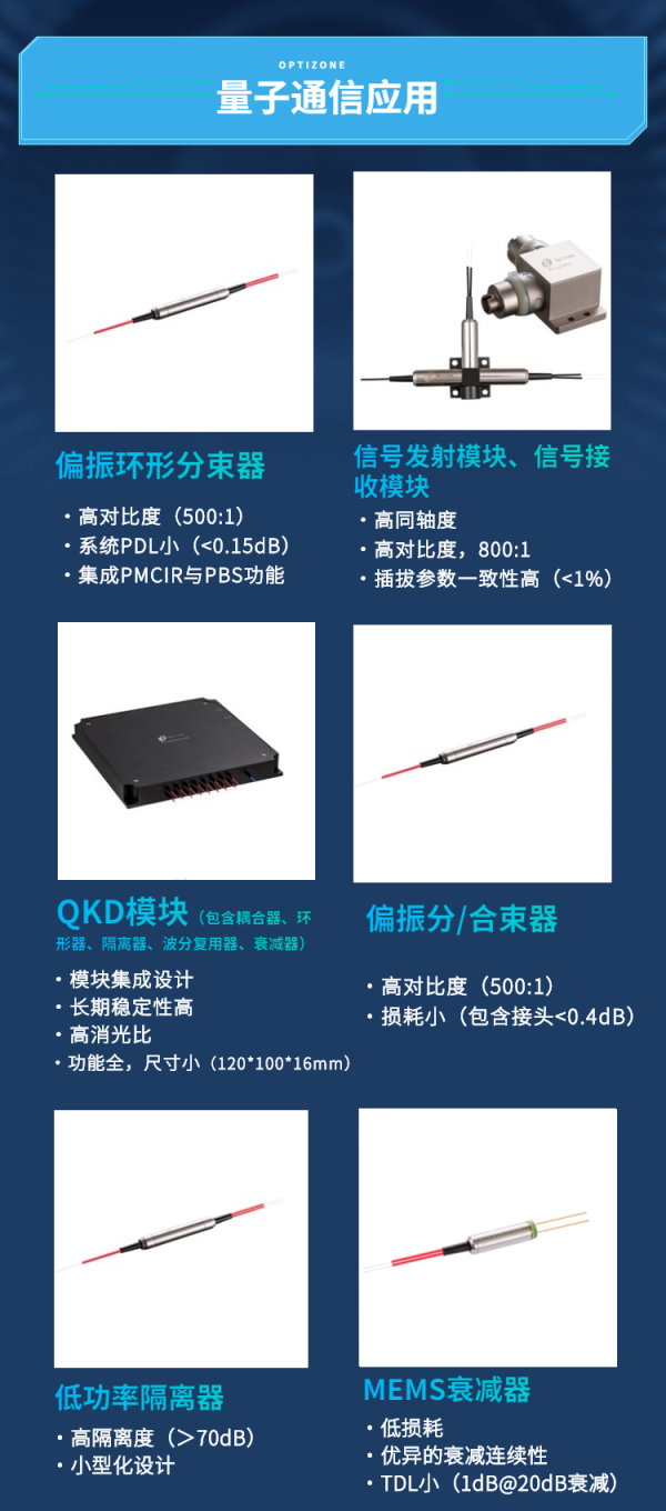 此外光越科技研發生產量子通信應用領域產品還包含:自由空間輸出的PBS和PMCIR模塊、高功率保偏環形器、高功率保偏隔離器、可調光衰減器、準直器、保偏環形器、保偏分束器、光纖透鏡、帶通濾波器、保偏波分復用器、保偏光纖陣列、保偏耦合器。