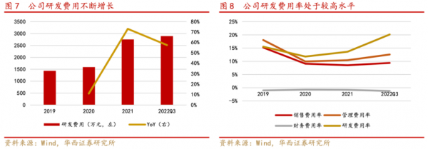 重視研發(fā),銷售/管理/財務費用率相對平穩(wěn)。2019-2021年及2022年前三季度,公司研發(fā)投入分別為1437萬元、1594萬元、2760萬元和2895萬元,研發(fā)費用率分別為15.55%、11.80%、13.61%和20.16%。公司對研發(fā)的重視程度較高,打造較強附加值產(chǎn)品。另外,2020年至今,公司財務費用率保持較低水平且穩(wěn)定,銷售/管理費用率略有抬升,屬正常波動。整體來看,公司近年來大力進行研發(fā)投入,導致研發(fā)費用率較高,是導致公司近兩年凈利率下降的主要原因。隨著公司未來營收規(guī)模的擴大,預計公司研發(fā)費用率有望恢復至歷史平均水平。