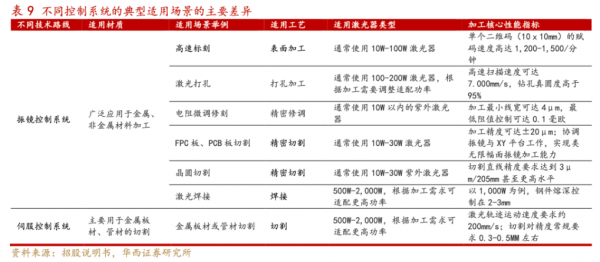 應用方面,兩者也有所差異。激光振鏡控制系統(tǒng)主要適用于小幅面、精密加工領域,除激光焊接、清洗等需要大功率激光器外,主要適用的激光器功率集中在1.5KW以內(nèi),可應用于標刻、鉆孔、3D打印、清洗、調(diào)阻、精密切割和焊接等;而激光伺服控制系統(tǒng)主要適用于大幅面切割領域,主要應用于焊接和切割。因此,振鏡控制與與伺服電機控制系統(tǒng)分別在不同應用場景各具優(yōu)勢,不存在直接的競爭關(guān)系或相互替代關(guān)系。